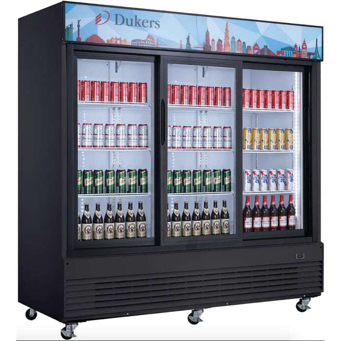 Refrigerated Merchandiser, reach-in, three-section, 78"W x 31-7/8"D x 80-3/8"H, bottom mount self-contained refrigeration, digital control, 33°F to 40°F temperature range, automatic defrost, (3) sliding tempered glass doors with replaceable gaskets, adjustable shelves, interior & canopy LED light with switch, white interior, black exterior, casters, R290 refrigerant, cETLus, ETL-Sanitation